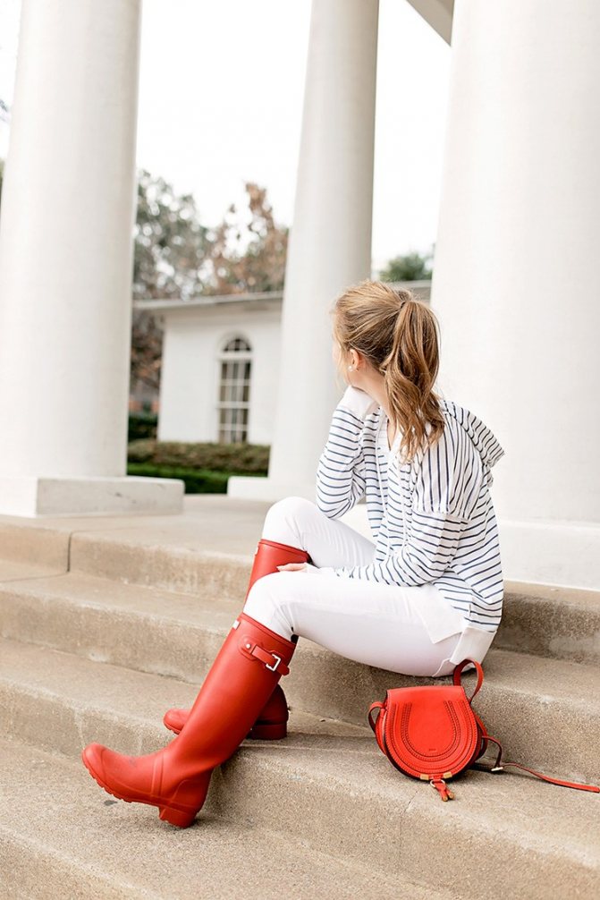 В гардеробе вместе с сапогами обязательно должно присутствовать несколько вещей такого же оттенка или близкого к ней. Это может быть шарфик, жилетка, кепка или сумка. Создавая тот или иной образ, не стоит забывать о них. Можно экспериментировать и комбинировать вещи между собой, не забывая о чувстве меры в количестве используемых цветов в одной подборке вещей.