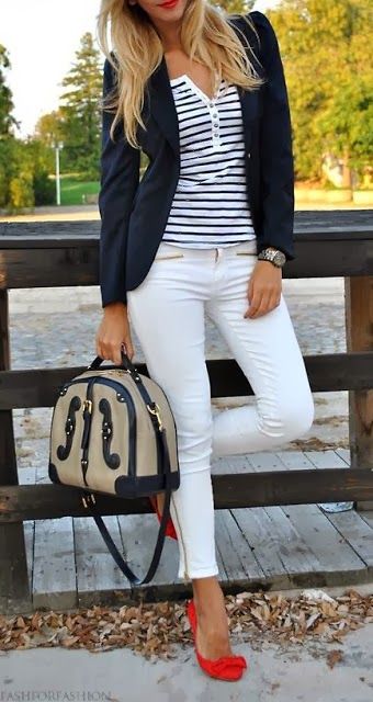Вы всегда можете надеть белые джинсы в рамках делового стиля, а кто сказал, что это запрещено? Надеваете те же туфли-лодочки, строгий жакет, блузку и белые джинсы. Можете использовать классическое сочетание наоборот: белый низ — черный верх.