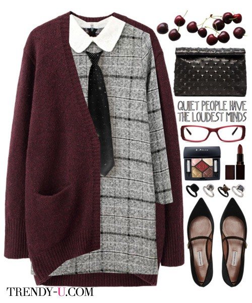 Кардиган цвета марсала и серое клетчатое платье