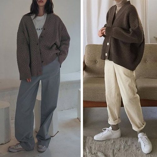 Коричневые кардиганы оверсайз в сочетании с широкими брюками