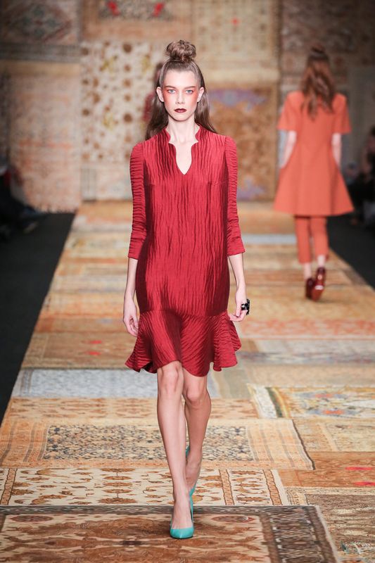 Модное красное платье длиной до колен свободного кроя с рукавами три четверти и V-образным вырезом из новой коллекции сезона весна-лето 2014 от Alena Akhmadullina хорошо сочетается с туфлями лодочками бирюзового цвета на высоком каблуке от Alena Akhmadullina.