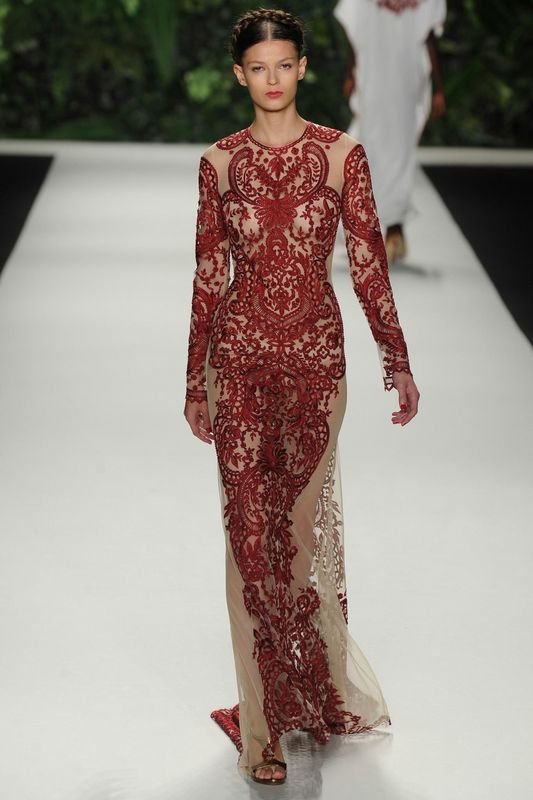 Вечернее красное платье длиной в пол, приталенного силуэта, с абстрактным рисунком, круглым вырезом и длинными рукавами из новой коллекции 2014 от Naeem Khan хорошо смотрится с босоножками темно-красного оттенка на каблуке Naeem Khan.
