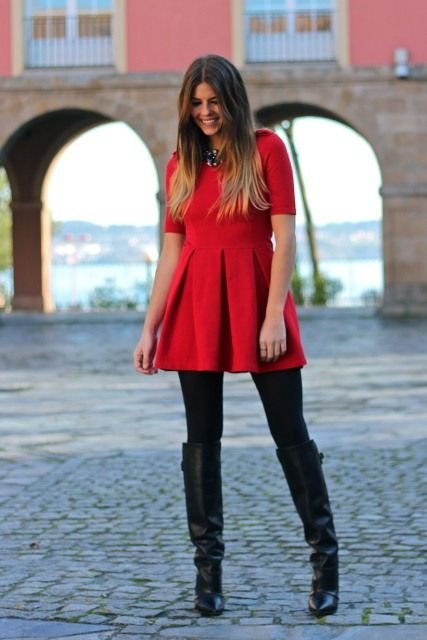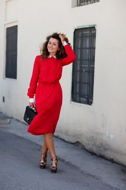 А вот для кэжуального лука красное платье с расклешенной юбкой или подолом в складку можно сочетать и с черной обувью, а также – с высокими темными гетрами. При этом волосы можно собрать в простой или высокий хвост, накинуть поверх платья однотонное пальто или даже черную кожаную куртку.