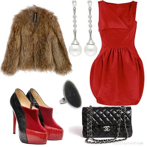 Короткое красное платье с объемной юбкой и ассиметричным квадратным вырезом прекрасно смотрится с шубкой светло-коричневого тона, клатчем черного цвета и ботильонами черно-красной расцветки на каблуке.