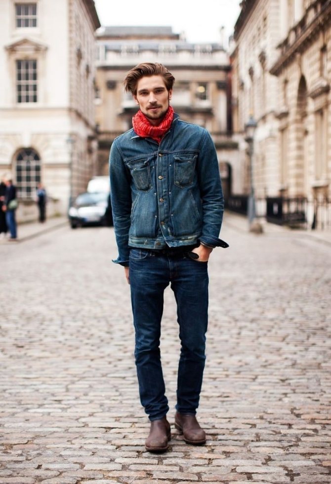 При ношении зауженных джинс допускаются рубашка в комплекте с футболкой, куртки с накладными карманами и большими воротниками, длинные шарфы и даже узкие пальто с контрастной отделкой.