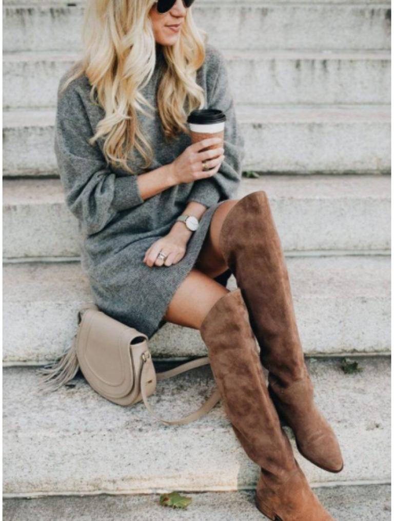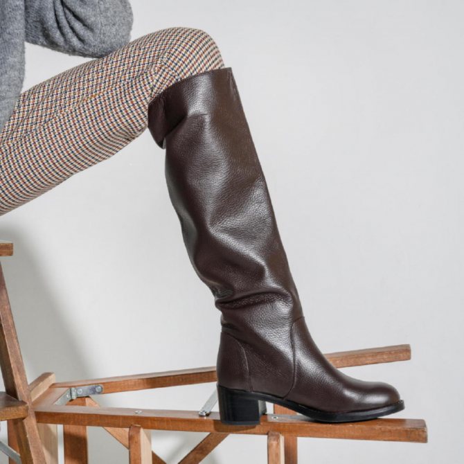 Первое, на что следует обратить при подборе одежды, так это на цвет и высоту голенища. К примеру, коричневые, болотные, горчичные и бежевые модели будут прекрасными напарниками вязаным платьям и туникам, кожаным юбкам, леггинсам и удлиненным свитерам в смежных оттенках.