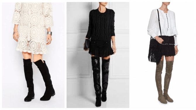 Вот несколько интересных вариантов сочетаний одежды с высокими сапогами на плоском ходу.