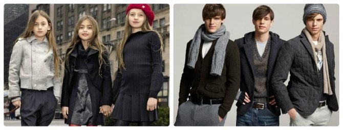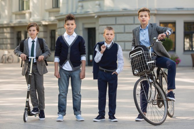 Внутри школьных стен подростки проводят большую часть времени. Ребенку важно чувствовать комфорт независимо от требований учебного заведения. Строгость деловой одежды разбавляют яркими вкраплениями в виде галстука или бабочки, привносят индивидуальность в выбранный образ. Дизайнеры предлагают модные костюмы для подростков-мальчиков синего, стального, шоколадного и черного цвета. К чопорной форменной одежде подбирают футболки или рубашки синего, красного или белого цвета. Кроме костюма в гардеробе джентльмена находятся прямые брюки черного, стального, коричневого или синего оттенка. Потребуется несколько водолазок, рубашек, футболок, мастерка, толстовка, джемпер и жакет. Рекомендуют примерить жакеты в красную или зеленую клетку (как дань элегантности). Из шотландки отшивают модные рубашки и пиджаки, которые носят с темными брюками. Любителям спортивного стиля предлагают комбинировать джинсы с футболками, водолазками и мастерками. В таком случае выбирают брюки приглушенного черного или серого тона, чтобы соответствовать форменному цвету школы.