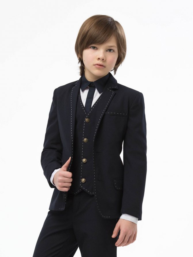 Не сдают своих позиций и деловые костюмы, современные фасоны которых будут оценены по достоинству как школьниками постарше, так и учениками начальной школы. Идеальным дополнением такого стильного образа станет однотонная или клетчатая рубашка, и чем ярче узор в этом случае, тем больше восхищённых взглядов одноклассниц получит ваш джентльмен. При выборе цветовой палитры, по мнению стилистов, стоит отдать предпочтение тёмно-синему, тёмно-коричневому или вишнёвому оттенку. Также весьма актуальны малахитовый, цвет фуксии и все оттенки серого, от тёмных до светлых.