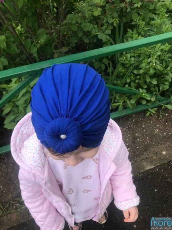 Это тренд уже не один сезон. Перешит из трикотажных штанов-легинсов пронзительно синего цвета. Эту шапочку сделала в один слой, она совсем легкая. Для того, чтобы сшить тюрбан, необходимо померить окружность головы ребенка и глубину шапки, от лба и до затылка.