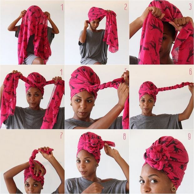 Как завязать тюрбан в африканском стиле, знают немногие. Для этой техники требуется высокая прическа. Волосы нужно собрать на затылке в пучок, можно даже с применением гульки для дополнительного объема. Для создания чалмы нужен широкий палантин. Этапы завязывания: