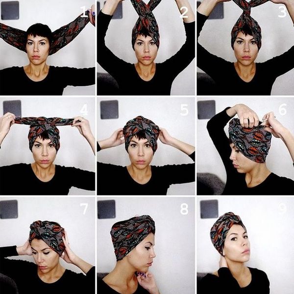 О том, как завязать тюрбан правильно, можно прочитать в сети. Для этого нужно собрать волосы пучком на затылке или на макушке. Такой головной убор подразумевает отсутствие челки, но некоторые модели интересно выглядят и с распущенными волосами.
