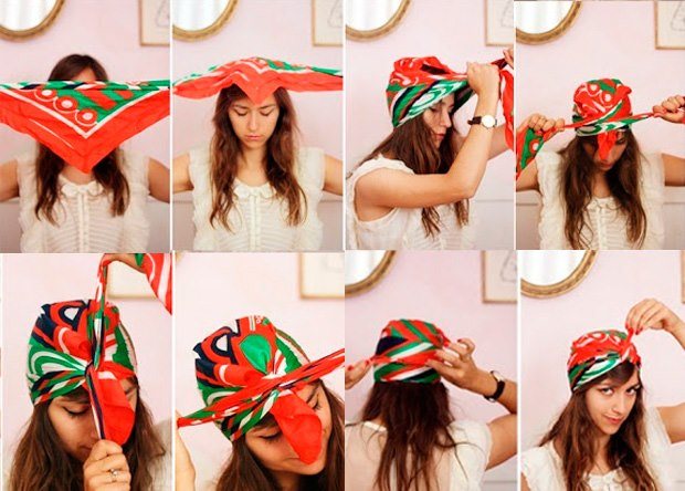 Интересно выглядят повязки-тюрбаны на голову из двух платков. Полотна должны быть однородной фактуры, но разных цветов. Действовать следует так:
