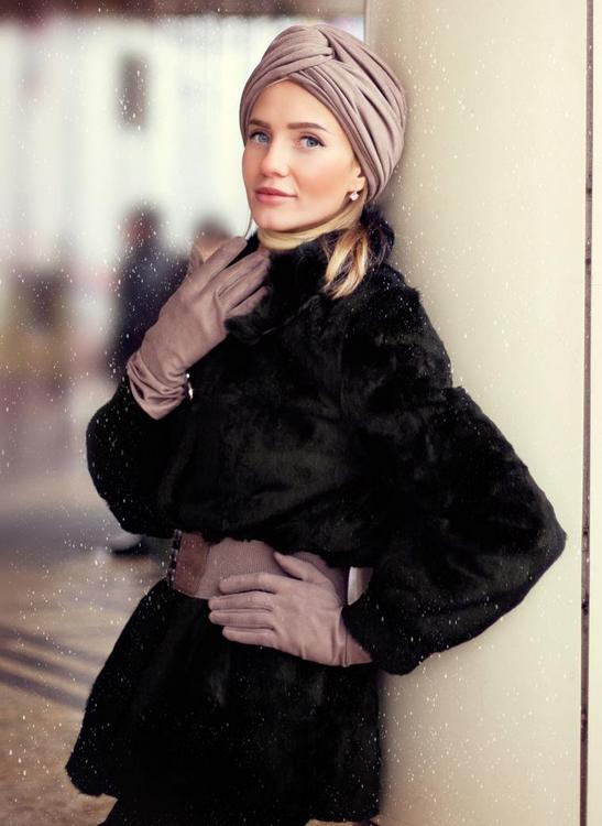 Кончики шарфа стоит расправить, чтобы они смотрелись пышнее. Такой способ носки тюрбана подходит под классическую верхнюю одежду, например, пальто или даже шубу.
