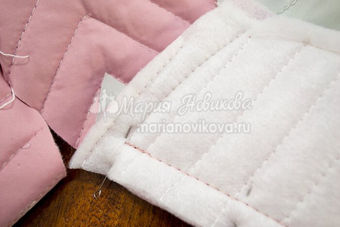 Выверните изделие на лицевую строну, выметайте кант по низу рукавов, подогните низ изделия на ширину подгибки и слегка приутюжьте. С изнаночной стороны припуски на рукавах и по низу изделия закрепите ручными стежками к утеплителю.