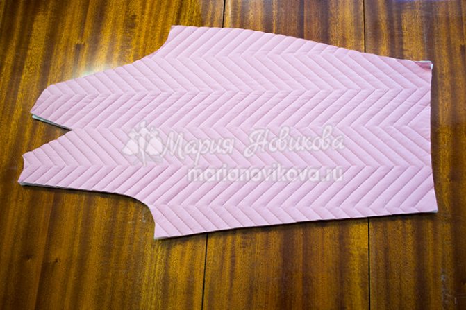 Так как ткань стёганая с утеплителем, то при раскрое нужно учитывать величину припусков. Во время пошива строчка стёжки быстро распускается на срезах, приходится сразу ставить машинные закрепки на местах роспуска строчек.