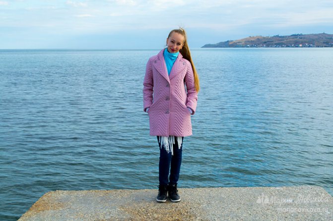 Укоротите подкладку по низу на 1,0 см. Выверните изделие на изнаночную сторону, совместите срезы, боковые швы на подкладке и изделии. Обтачайте низ пальто шириной шва 0,7 – 1,0 см., припосаживая подкладку. На полочках строчка должна плавно переходить к строчками обтачивания подбортов. По центру спинки оставьте отверстие 20,0 см. для выворачивания изделия.