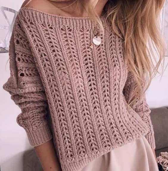 Секрет успеха этого элегантного пуловера в полоску — удачно подобранные оттенки пряжи и оригинальный ажурный узор.