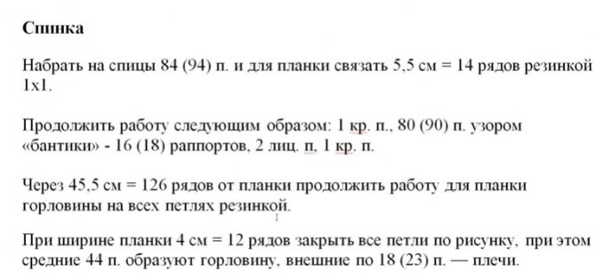 Плотность вязания: 23 п. х 30 р. = 10 х 10 см; планка на 11 п. = 3 см.