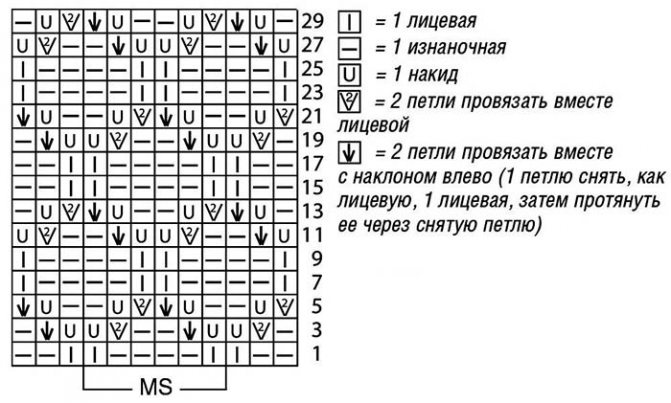 Основной узор: число петель кратно 5 + 3 + 2 кром. Вязать по схеме, на которой приведены лиц. и изн. р. Начинать с 1 кром. и петель перед раппортом, повторять раппорт, заканчивать 1 кром. Повторять с 1-го по 6-й р.