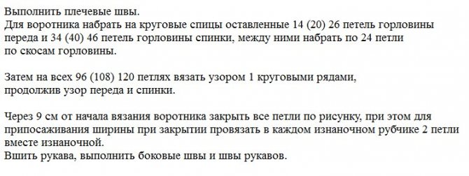 Выполнить швы рукавов матрасным швом. Для планки горловины набрать по краю горловины на круговые спицы № 8 лазурной нитью 64 п. (= 28 п. горловины спинки и 34 п. горловины переда), провязать 2 круг.р. узором планки, затем свободно закрыть все петли, как при лицевом вязании.