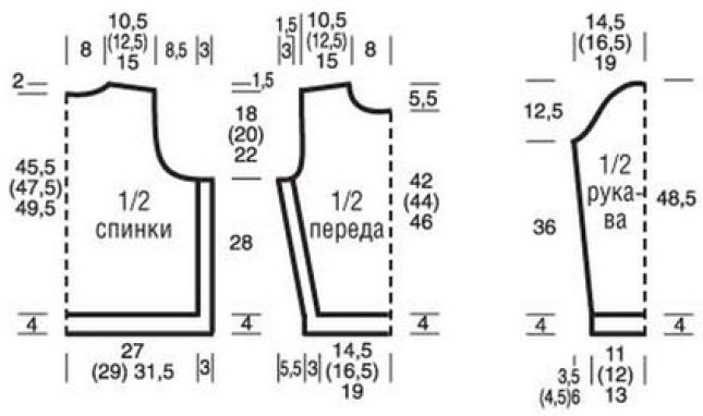 через 56 (58 — 62) 64 см от начального ряда закрыть оставшиеся 11 (12-13) 14 п. плеча.