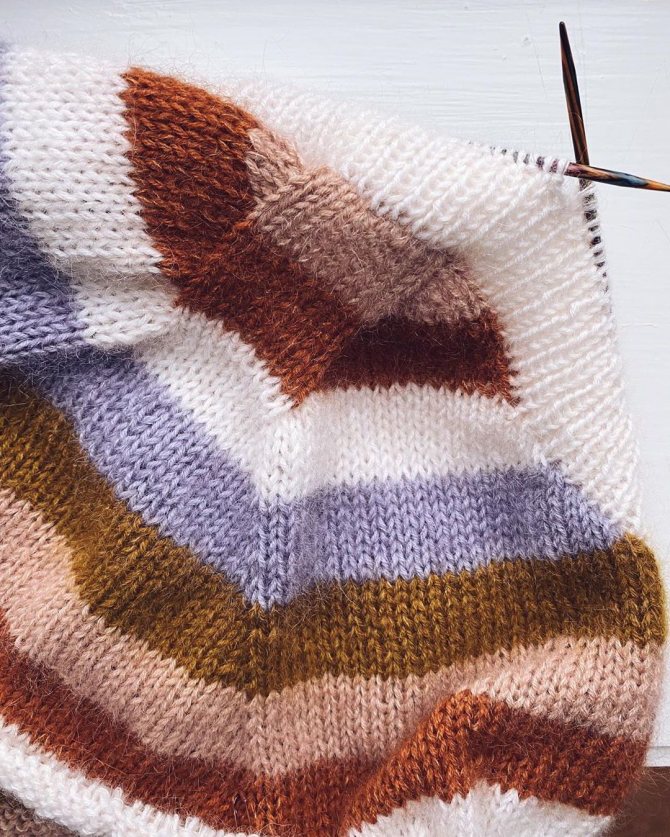 Чередование полос: вяжите *волнистым узором 12 рядов коричневой нитью, 4 ряда платочной вязкой пестрой нитью, 12 рядов волнистым узором белой нитью, 4 ряда платочной вязкой пестрой нитью*, повторяйте *-*.