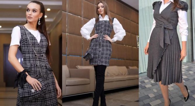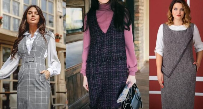 Осенние сарафаны традиционно шьются из костюмных тканей нейтральных расцветок. Некоторые из моделей больше похожи на платья без рукавов. Но все они традиционно носятся поверх водолазок, рубашек или блузок. Конечно, мода последних месяцев приучила нас к минимализму.
