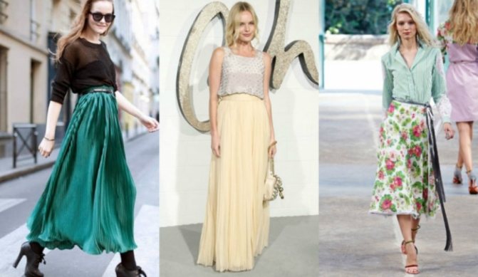 Жарким летом будут уместными юбки-полусолнце, которые украшены бантами и другим небольшим изящным декором. Также подойдёт мелкая плиссировка. Она очень выгодно скроет имеющиеся недостатки фигуры. Визуально уменьшат объём бёдер боковые вставочки на модели. Их ширина обязана быть уже центральной части. Усилить эффект поможет контрастность цвета вставок и основного полотна юбки.