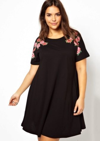 Грушевидный фасон станет отличным выбором для полных дам. Ведь сарафан или платье-трапеция скрывает недостатки фигуры и визуально стройнит. При этом стоит обратить внимание на однотонные модели и крупный принт. Если вы не можете похвастаться идеальными пропорциями ног, то выбирайте модель длиной до середины колена. Однако в этом случае обязательной составляющей будет являться обувь на каблуке. Также можно примерить длинные платья-трапеции. Но не стоит выбирать слишком широкий крой. Подол такого платья должен быть не больше ширины плеч. В противном случае вы получите образ очень тучной дамы.