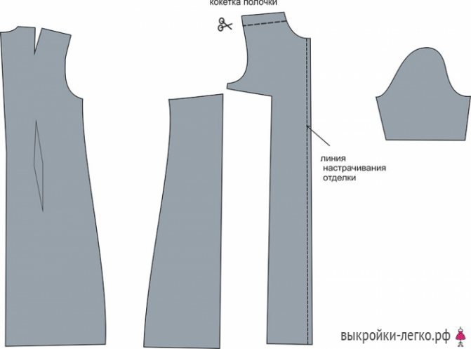 Моделирование. На деталях выкройки спинки и полочки провести модельные линии рельефов, проходящие от пройм до низа платья через талиевые вытачки, на спинке часть раствора перенести к средней линии спинки, для наибольшего прилегания в этой области. Нагрудную вытачку открыть в пройме, подробнее о переносе вытачек читайте здесь. Остается только наметить припуск под шлицу. Если разница между обхватами талии и бедер большая и растворы вытачек на приталивание составляют более 3-3,5 см каждая, вытачку нужно разбить на две, иначе в готовом изделии появятся некрасивые заломы в области талии.
