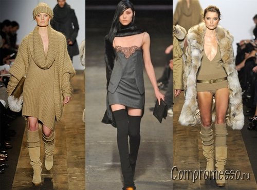 Современная мода вносит в нашу жизнь самые необычные идеи, вязаная сказка становится частью жизни, а дизайнеры предлагают сочетать с носочками шифоновые платья, наряд можно дополнить полушубком или пуховиком с трикотажными элементами. Модные нынче меховые жилеты и пальто без рукавов можно комбинировать с вязаными перчатками выше локтя или съемными вязаными рукавами, но они должны совпадать по цвету и узору с вашими носочками. Высокие перчатки или митенки могут дополнить и шерстяное платье или тунику.