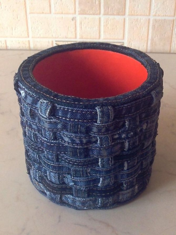 Оригинально смотрятся и настольные органайзеры из старых джинсов в виде ящичков и цилиндров. Джинс можно использовать практически всюду. Если вы надумали избавиться от старой ненужной джинсовой одежды, пересмотрите фото полезных переделок денима.