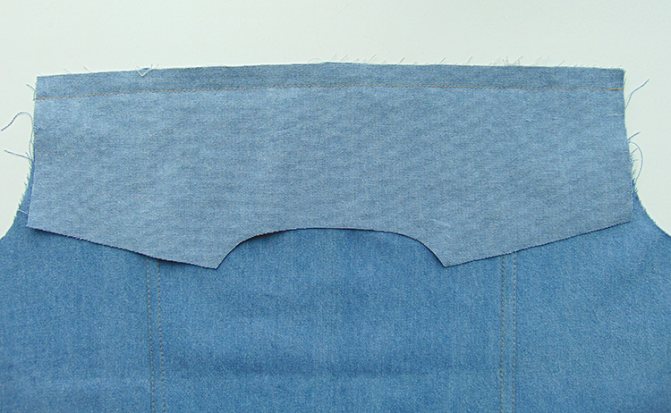 Заготовка воротника для джинсовой куртки. Верхнюю деталь воротника сложить с нижней лицевыми сторонами. Проложить соединяющую строчку по трём сторонам, ориентируясь на прокладку. Строчку закончить не доходя 1 см до нижнего среза. Воротник пригладить утюгом. Срез нижнего воротника подрезать до 0,3 см. срез верхнего воротника заутюжить внутрь. Вывернуть. Отстрочить воротник на 0,1-0,2 см.