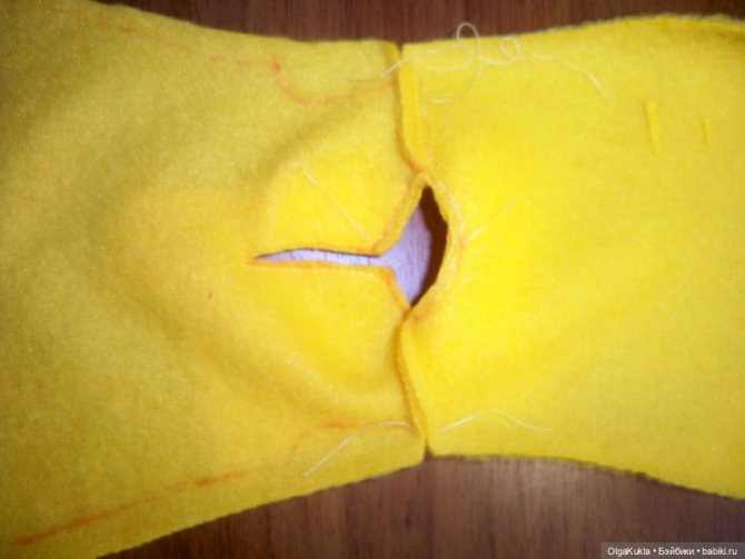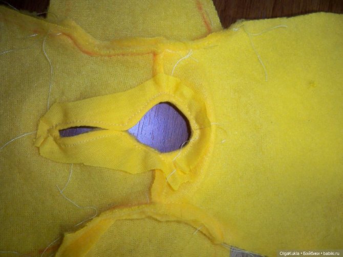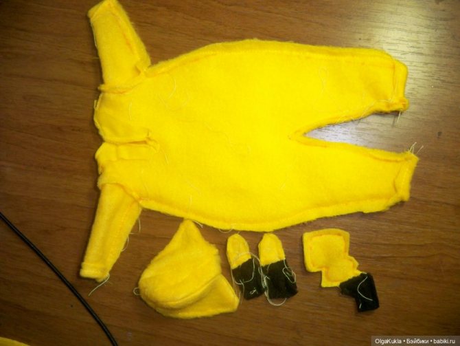 Вырезаем с припуском (я делаю большие припуски, около 1 см), все, кроме горловины, разреза. Пространство между брючин я тоже не вырезаю. Для ушей и хвоста вырезаю заготовку из желтой и черной ткани, как на фото.
