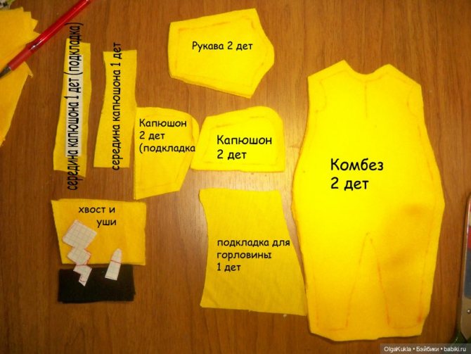 3. Отдельно на подкладочной ткани (она тоже должна быть трикотажная) обводим еще раз выкройку капюшона. Капюшон кстати на выкройке имеется в 2-х вариантах: с серединкой и без. Вырезаем. 4. Садимся за швейную машинку и застрачиваем: плечевые швы на комбинезоне, подшиваем низ рукава, сострачиваем детали двух капюшонов, сострачиваем черную и желтую ткань (для хвоста и ушей)