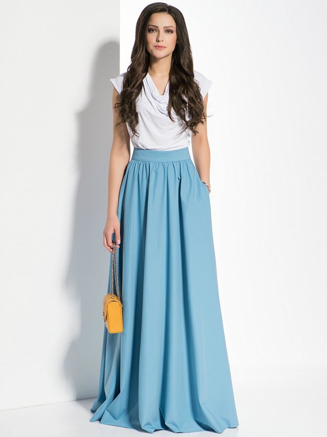 Классический образ получится с укороченным светлым топом, макси юбочкой на резинке и классической шпилькой. Для похода на городскую прогулку стоит выбрать вариант мини и легкую маечку. Хорошее сочетание обеспечат босоножки на плоском ходу.