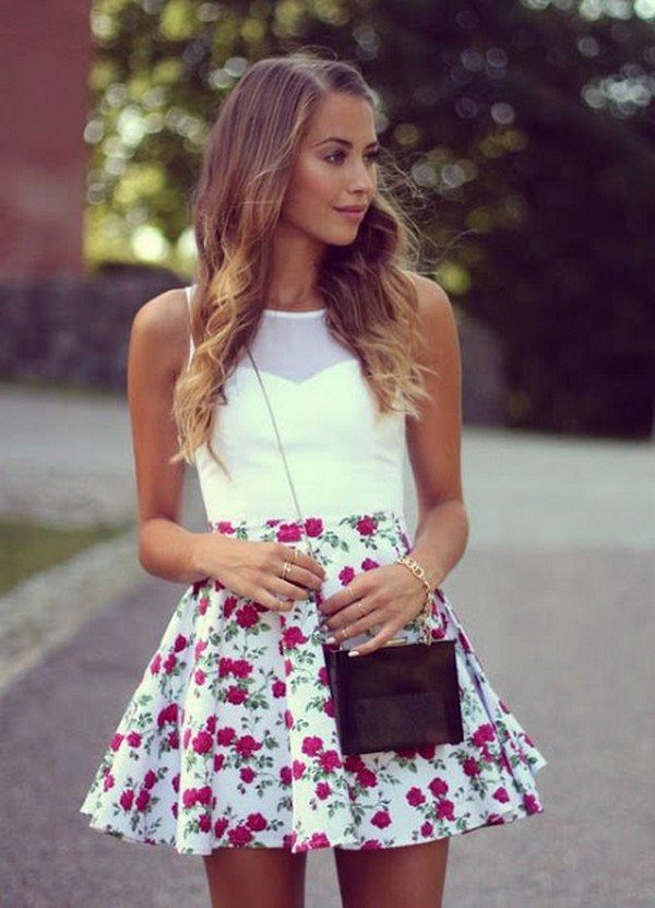 Модные дизайнеры предлагают образы с принтованными изделиями с флористическими мотивами. Просто выбрать изделие в любом оттенке цвета, соответствующем настроению и случаю. Верх лучше подбирать однотонный, облегающий грудь и плечи.