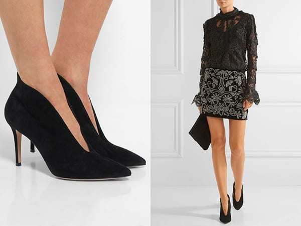 Распространенный прием дизайнеров – это комбинация острого мыса с V-образным вырезом. Такое сочетание прекрасно подходит модницам, которые хотели бы придать ножкам изящности и стройности.