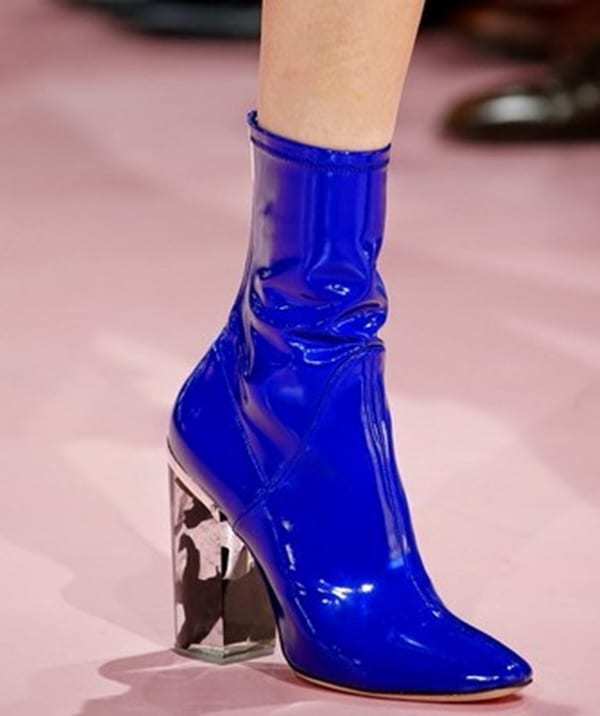 - Неординарная форма каблука с экстравагантным декором. Теперь каблук приобретает важную декоративную роль, некоторые модели можно назвать настоящим произведением искусства. В моде будут ботильоны с прозрачными каблуками необычных форм.
