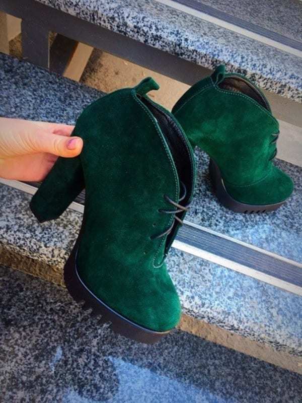 - Высокая платформа – смотрится экстравагантно, привлекает внимание окружающих. Такой вид ботинок часто выполнен из материала яркого цвета или имеет декоративные детали.