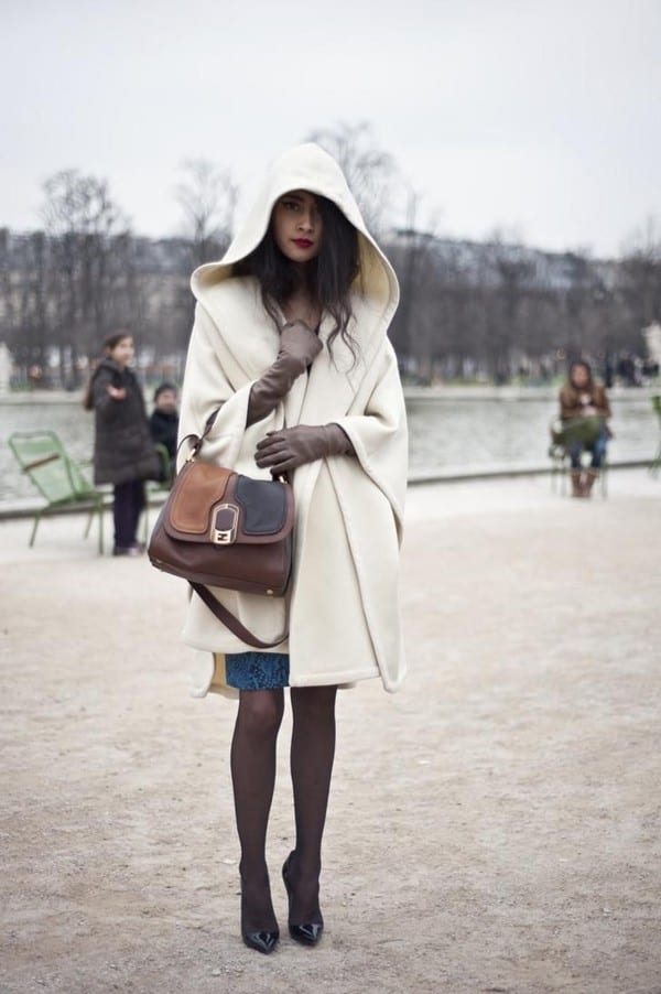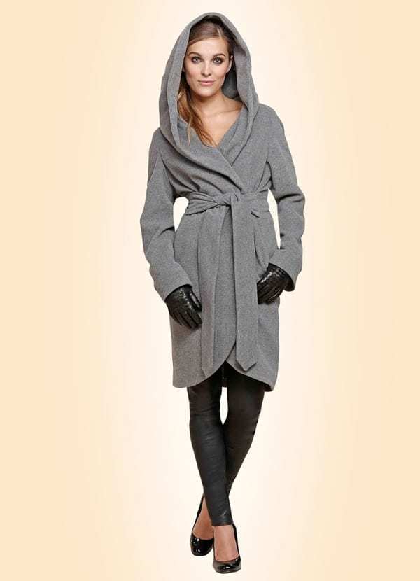 Стильно выглядит короткое пальто с капюшоном, оно позволит продемонстрировать красоту стройных ножек и сохранить при этом комфорт.